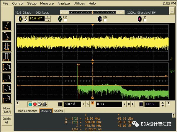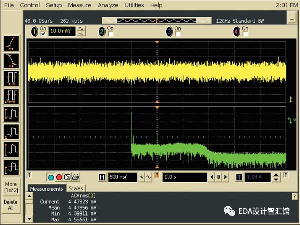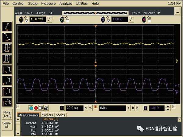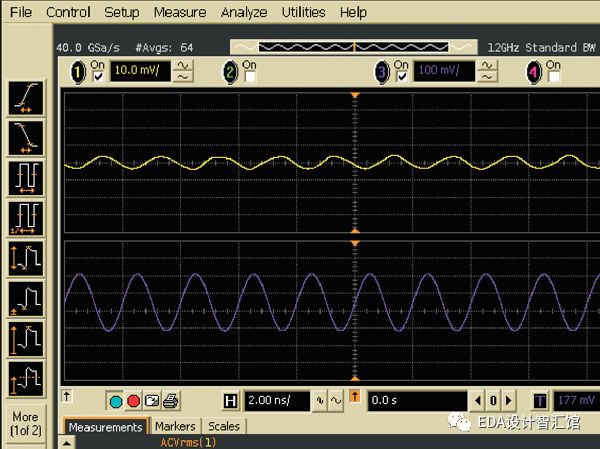 如果能够以除随机噪声源之外的信号作为触发并使用平均,那么所有和此信号不相关的噪声元素都会被减小或者消除。图7和图8展示了这种方法。在图7中,示波器使用500MHz正弦波作为触发,并平均64次。紫色的通道是500MHz的触发源,在示波器上用另一个通道测量。黄色的通道是电源噪声,把所有和500MHz信号不相关的噪声元素通过平均消除。