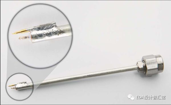 很多电源都可以驱动50欧姆负载。1.5V电压驱动50欧姆负载只需要3mA电流。这就可以直接使用50欧姆同轴电缆连接到电源,示波器使用50欧姆输入来代替10:1的探头,从而可以更灵敏。也可以使用同轴隔直电容。1:1的探头很容易制作,如图9所示,在线末端把外面的金属壳剥掉,并焊接一个地线,也可以使用带弹簧的地。