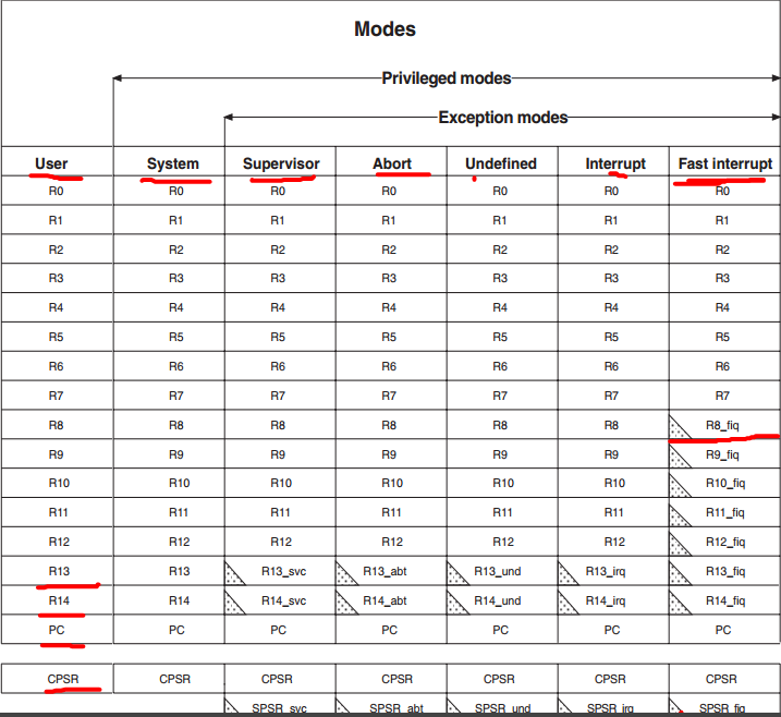 (7)sys(11111):系统模式,用于运行特权级的操作系统任务(armv4以上版本才具有)