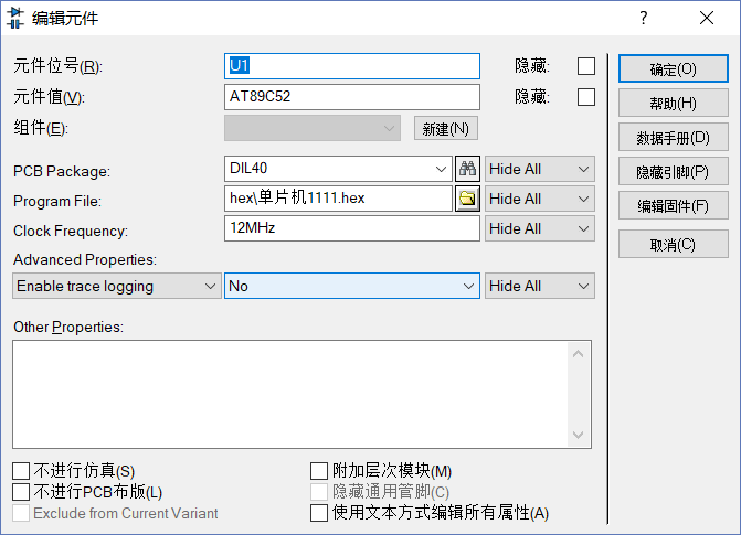 第3步:回到Protues仿真,双击单片机,就会弹出一个窗口,在Program File栏加入我们刚才产生的hex文件就可以了,然后点击运行就可以运行了。很多人仿真的时候可能没有示波器窗口,点击运行后,然后点击上方“调试”,再点击弹出窗口的最后一行,示波器窗口就弹出来了,就可以看到单片机产生的波形了。