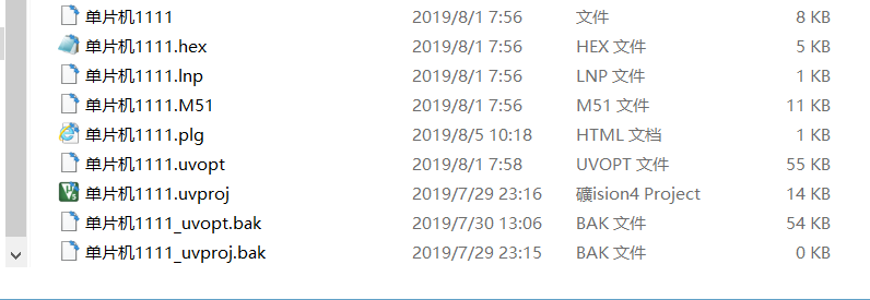 第2步:单片机仿真图形界限完成之后,就是写程序了,程序写好之后,需要下载Keil软件将程序转换为单片机能识别的机器语言,即hex文件,程序可以使是c语言,也可以是汇编语言。在Keil上运行程序没有错误后就会自动生成hex文件,Keil的使用大家自行查询。下面那个“单片机1111.hex”就是我们写好的程序转换为hex文件了,其他的是附加产物。