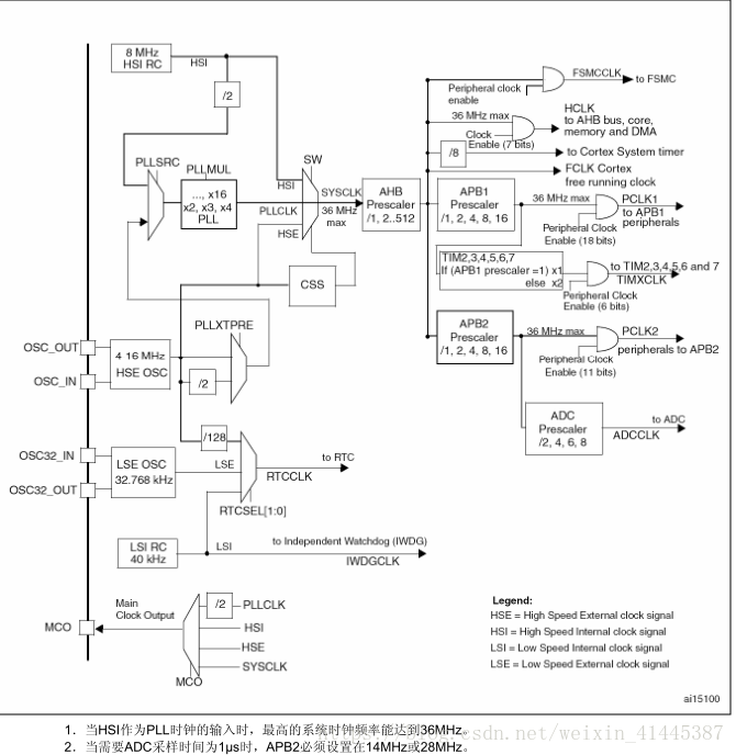 多个预分频器用于配置AHB的频率、高速APB(APB2)和低速APB(APB1)区域。AHB和APB的最高频率是36MHz。