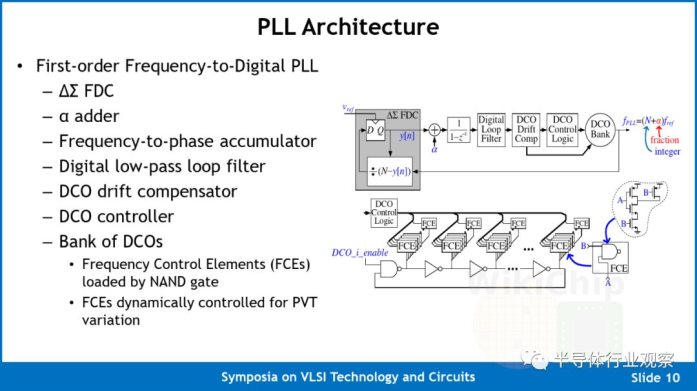 Celerity上的Manycore Mesh时钟由自定义数字PLL提供。这是一个相当简单的一阶ΔΣ频率数字转换器(FDC)PLL。该实现使用了一组16个DCO ,每个实现为环形振荡器,其反相元件装有NAND门FCE,如以下幻灯片中的电路图所示。这样做是为了仅使用标准单元来实现整个设计。为此,整个数字PPL是完全合成的并自动放置和布线的设计。该PLL在其16纳米芯片上的频率范围为10 MHz至3.3 GHz。