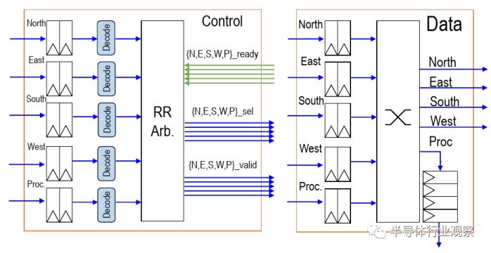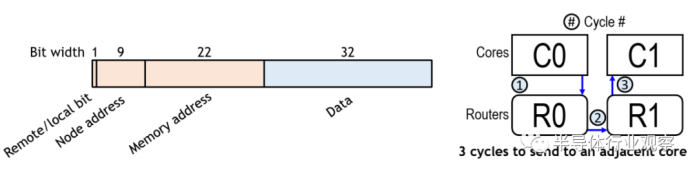 在多核阵列中的496个节点中,每个几点都有一个路由。路由本身在每个基本方向(N,S,E,W)的输入处都包含两个元素的FIFO,以及在网络拥塞情况下用作临时存储的控制处理器。他们使用循环仲裁(round-robin arbitration)来确定数据包的优先级,从而可以在每个周期对每个方向进行仲裁(arbitrate )。他们使用尺寸顺序的布线(在一个方向上减小偏移,然后再移动到另一方向)。通过简单的设计,他们可以将整个路由实现为单级设计,而节点之间没有管道寄存器。换句话说,每跳只需要一个周期。例如,任何相邻的核心存储区的延迟只有3个周期-转到本地路由,跳到相邻路由,最后去邻居的记忆空间,路由器与内核位于相同的时钟域,这意味着它们还可以在高达1.4 GHz的频率下运行。