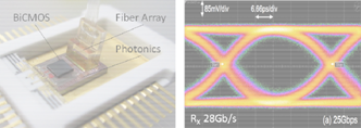 图2左图:一个采用3D层叠技术在光子器件上安装BiCMOS器件的光学封装测试芯片;右图:该芯片在RX 25/28Gbps时的电眼测量图