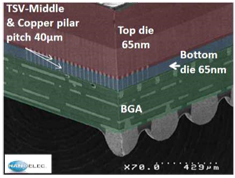图3:置于65nm逻辑层上的Wide IO存储器,顶层/底层具有1250个TSV互连线,1000个倒装片铜柱(底部/ BGA)。