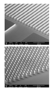 图13左图)在一个热点密集且密闭Wioming 3D 电路上的微流体冷却技术(2000 W /cm²)。右图)在Si中蚀刻的微通道和鳍引脚的SEM图像