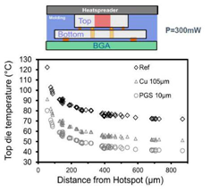 图12:3D电路被动散热器评估:顶层裸片使用铜散热器与使用热解石墨薄板(PGS)散热器的温度原位测量对比(300mW热点)。