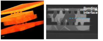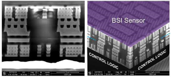 图15:混合键合封装的SEM图像(俯视图和3D视图),包括BSI成像器结构+逻辑的所有金属层。
