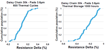 图18:混合键合可靠性实验结果。热循环(左图)和储热(右图)测试的电阻离差小于0.5%。