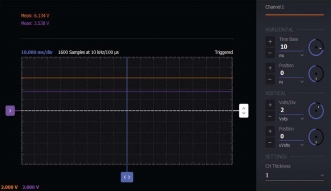 使用步骤2所述的操作,利用示波器通道2测量RS中的电流,并在示波器XY模式下绘制齐纳二极管两端电压与电流的关系图,研究齐纳二极管的电流/电压特性曲线。务必调整水平电压范围和偏移,以将6.2 V击穿电压包括在内。讨论您的结果,尤其要讨论齐纳二极管与常规二极管的相似和不同之处。