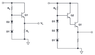 增加二极管D2与齐纳二极管串联,用以部分抵消射极跟随器Q1引起的额外VBE压降。类似地,在达林顿配置中添加两个二极管(D2、D3),同样用来部分抵消达林顿跟随器的两个VBE压降。