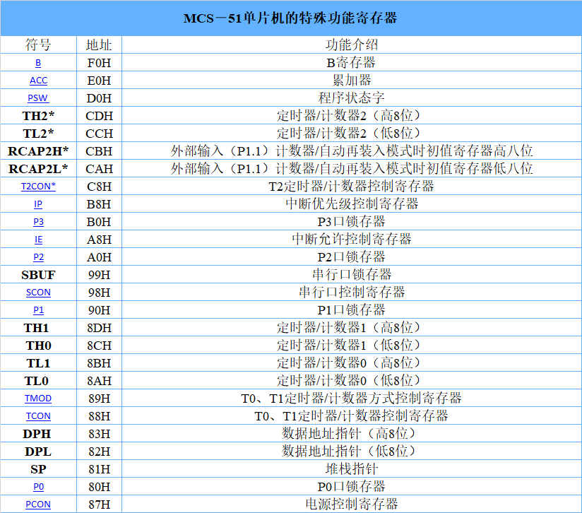 在51单片机内部有一个CPU用来运算、控制,有四个并行I/O口,分别是P0、P1、P2、P3,有ROM,用来存放程序,有RAM,用来存放中间结果,此外还有定时/计数器,串行I/O口,中断系统,以及一个内部的时钟电路。在单片机中有一些独立的存储单元是用来控制这些器件的,被称之为特殊功能寄存器(SFR)。这样的特殊功能寄存器51单片机共有21个并且都是可寻址的列表如下(其中带*号的为52系列所增加的特殊功能寄存器):