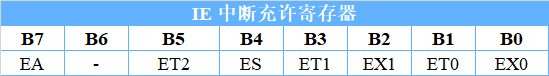 EA (IE.7):EA=0时,所有中断禁止(即不产生中断);EA=1时,各中断的产生由个别的允许位决定