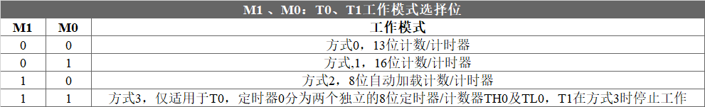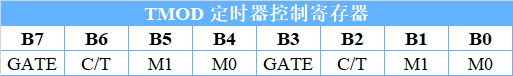 GATE :定时操作开关控制位,当GATE=1时,INT0或INT1引脚为高电平,同时TCON中的TR0或TR1控制位为1时,计时/计数器0或1才开始工作。若GATE=0,则只要将TR0或TR1控制位设为1,计时/计数器0或1就开始工作。