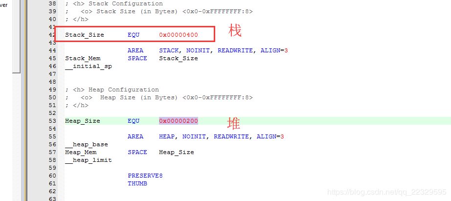 __initial_sp 这个参数是栈顶地址,因为栈的增长是向下增长,所以这个参数我们可以理解为栈的起始地址,我设置的栈尺寸是0x400,所以栈的地址范围是 __initial_sp ~ (__initial_sp - 0x400),__initial_sp 这个参数是keil编译代码之后计算出来的,有多种方法确定。