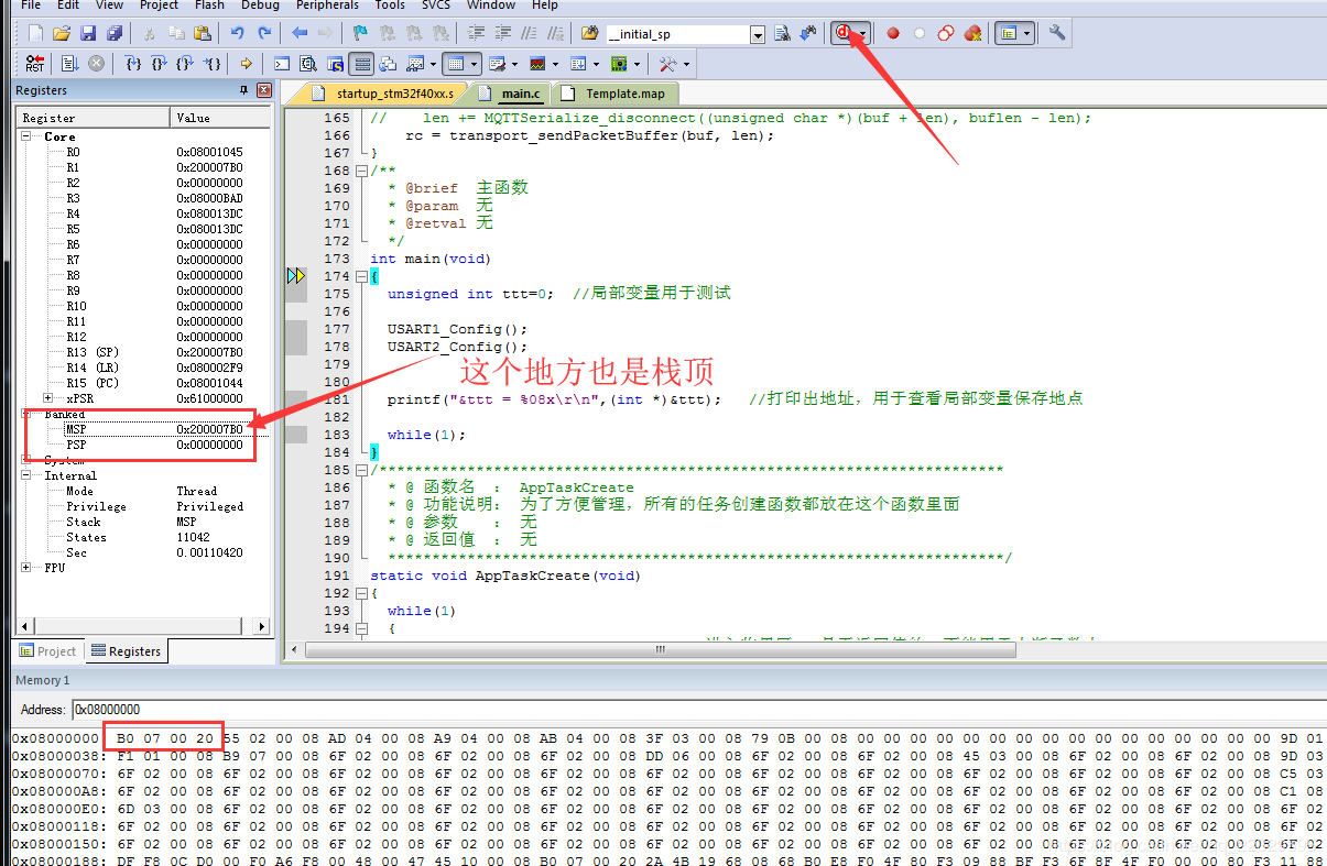 (2)方法2:Debug执行代码,然后查看0x08000000这个地址的数据,前四个字节就是