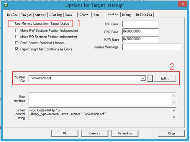 说明:勾选1,则使用系统默认生成的分散加载文件,好处是你不用自己动手写,缺点是,只能生成最简单的分散加载,没有办法适应用户需要的很多功能;2的红色方框内就是分散加载的路径,这里是我自己工程的路径,大家可以根据自己需求去弄,点击Edit可以编辑;