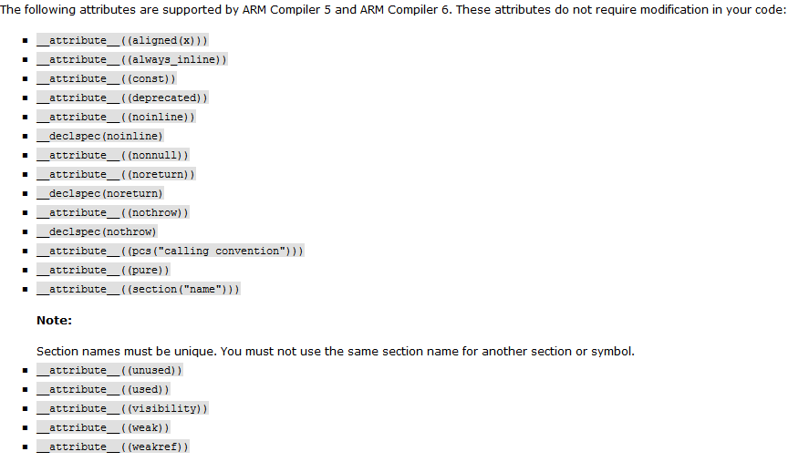 __attribute__关键字用于指定函数、变量等Symbol的属性,是编译器可以识别的C语言关键字,当然这个要看使用的是什么编译器,不同的C编译器语法上略有差别,有的C编译器甚至还不支持__attribute__关键字,以下是Keil的帮助文档里面的关于__attribute__关键字可实现的功能: