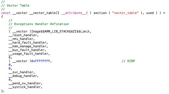 上面代码省略了中断向量表部分。ECRP为LPC54608的加密位,0xffffffff为不加密。这里不同的MCU处理方式不同,不具备什么代表性。