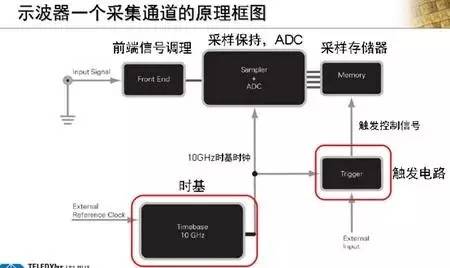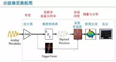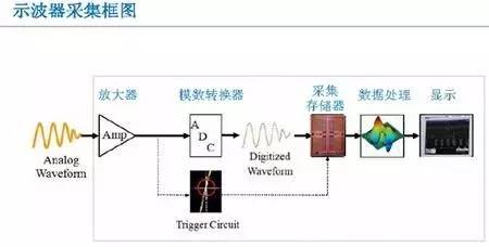 要熟练了解示波器必须知道示波器的内部结构,示波器包括放大器,放大器限制了示波器的带宽;模数转换器,采集存储器,决定了示波器的存储深度;数据处理以及最后的显示。