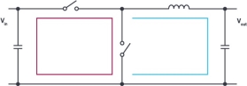 开关稳压器中需要不断开关电流。这些电流通常比较大。每当电流流动时,会产生磁场。如果快速开关大电流,就会产生交变磁场。此外,如果开关电流时,路径中存在寄生电感,就会产生电压失调。电流会容性耦合到相邻的电路部件中,并增加电源的噪声辐射。综上所述,我们可以说开关电流是导致开关模式电源产生噪声的主要原因。图1显示了简化的降压转换器拓扑结构。所有存在连续电流的线路都用蓝色表示。所有快速开关电流的线路都用红色表示。
