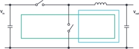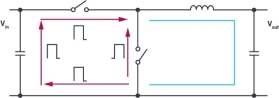 图1中的红色线路是关键线路。它们看起来像一个电流回路,因此被称为回路。热回路意味着这个回路特别关键,因为它涉及到快速开关电流。如果我们仔细观察这个回路,可以看到图1中的红色回路从来没有真正的电流流过,这个因为两个开关从来不会同时打开。它只是单条线路的组合,在特定时间会有电流流过,在其他时间则没有电流流过。在图2中,各连接线路旁的箭头表示电流流动的方向。同时,通过指定的符号表示电流流过的时间。在其他时间,没有电流流经该导体。