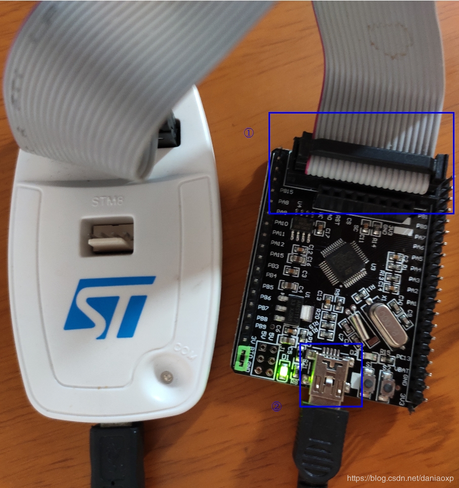 由于之前买过原子开发板,所以首先采用st-link下载,有需要的可以去网上单独购买(50元多),不过先看完整个教程看哪种方法适合你。该方法需要接两处,一处是st-link排针口,因为不能提供电源,所以另一处是电源,如下图所示,左边白色的为st-link。
