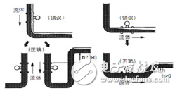 测量液体时为保证测量,涡街流量计的 管道必须充满液体。涡街流量计安装在水平管道上时,应将下游段的管道高于涡街流量计,以保持满管;当流体向下流动时,应将下游段的管道高于涡街流量计,以 保持满管。流量计安装在垂直管道上时,流体应该向上流动,当流体向下流动时,应将下游段的管道高于涡街流量计,以保持满管,如图3所示。