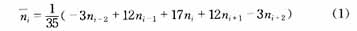 由于测量过程的统计性原理误差,使得X射线谱形式带有统计涨落的特点。所获取的X射线谱统计误差更为明显。在寻峰时,计数的统计涨落可能被误认为是一个谱峰,因此需要对谱先进行光滑预处理。本系统选用二阶多项式五点光滑法。具体计算公式为:![]()