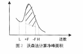 本系统选用沃森法计算净峰面积(图2)。在峰边界L、H内取点F作为计算本底的宽度(F又称为面积因子),β1,β2为左、