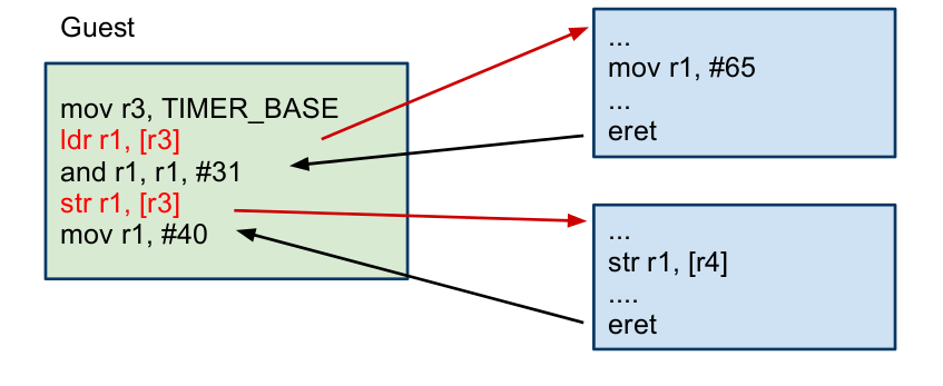 标准的ARM架构是不符合可虚拟化模型的,有很多敏感指令在非特权模式下执行却不会产生trap。比如CPS指令,这条指令的作用是改变处理器状态,当这条指令在用户态执行时不会产生trap,甚至没有任何效果,可以认为是简单的跳过。即使所有的敏感指令都会产生trap,在ARM架构上用上述的trap-and-emulate技术也是很困难的,因为ARM的敏感指令非常多,只要和特权资源交互的指令都是敏感指令,比如虚拟内存子系统,中断控制子系统和协处理器,用上述方式的话开销太大,对系统性能有很大冲击。比如,arm-v7架构不支持页表访问的虚拟化,那么就需要影子页表,每次访问guest pa都需要trap,同样地,中断控制器也需要被仿真,当中断很频繁的时候(timer tick),这种仿真的开销也是非常大的,为了克服这种种弊端,ARM推出了virtualization extension。