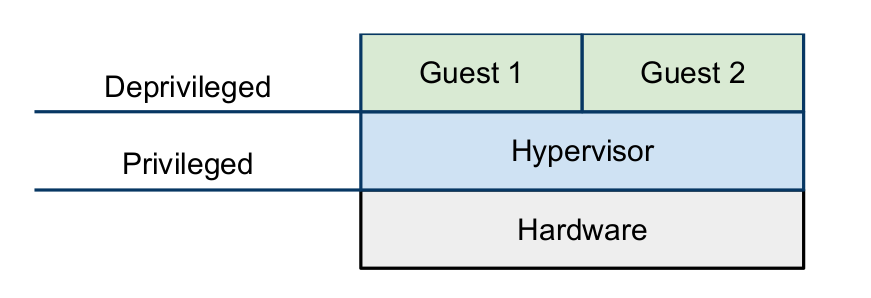 虚拟化是一个概念,单从这个概念的角度来看,只要是用某一种物品去模拟另一种物品都可以称为虚拟化,甚至于有些饭店用豆腐做出肉的味道,我认为这也可以称为一种虚拟化。但是这里我们主要讨论的是计算机领域的虚拟化,我们这样定义虚拟化“虚拟化是将单一物理设备模拟为相互隔离的多个虚拟设备,同时保证这些虚拟设备的高效性”。这个概念的定义里还包含了对虚拟化的要求,也就是这里的隔离性(isolated)和有效性(efficient)。我们常说的hypervisor,有些书也把它称为VMM(virtual machine monitor)则是一个直接运行在物理硬件上的软件,它的功能就是管理物理硬件,以便在不同的虚拟机之间共享这些物理资源(cpu,内存,外设等等),既然hypervisor直接给物理外设打交道,那它当然需要运行在特权模式了,在过去没有virtualization extesion的情况下,guest os和guest application只能都运行在de-privileged模式,如下图所示。