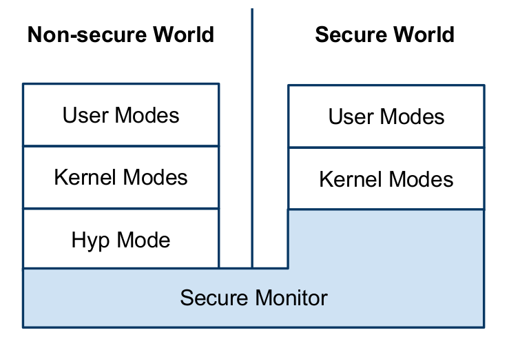 显然,除了应用程序运行在user模式以外,其他全部运行在特权模式。ARM的virtualization extension需要处理器支持TrustZone extension,我们来看一下TrustZone是什么。TrustZone将处理器的执行状态分为两个世界: