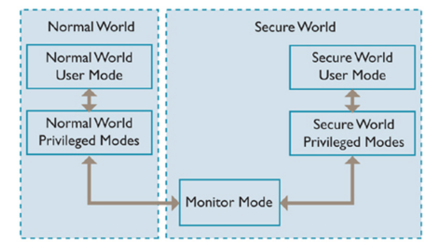 这里的两个世界和处理器模式是重叠的,软件可以在任何模式、任何世界上运行。那么secure world和non-secure world的区别在哪呢?这里的secure又从何而来?是这样的,secure world有自己独有的内存和外设,这部分内容只有运行在secure world的软件可以访问,运行在non-secure world的软件是不可以访问的。这里引入了一个新的处理器模式,monitor mode,它运行在secure world,被用于做双系统(secure and non-secure world)之间的切换,如下图所示。