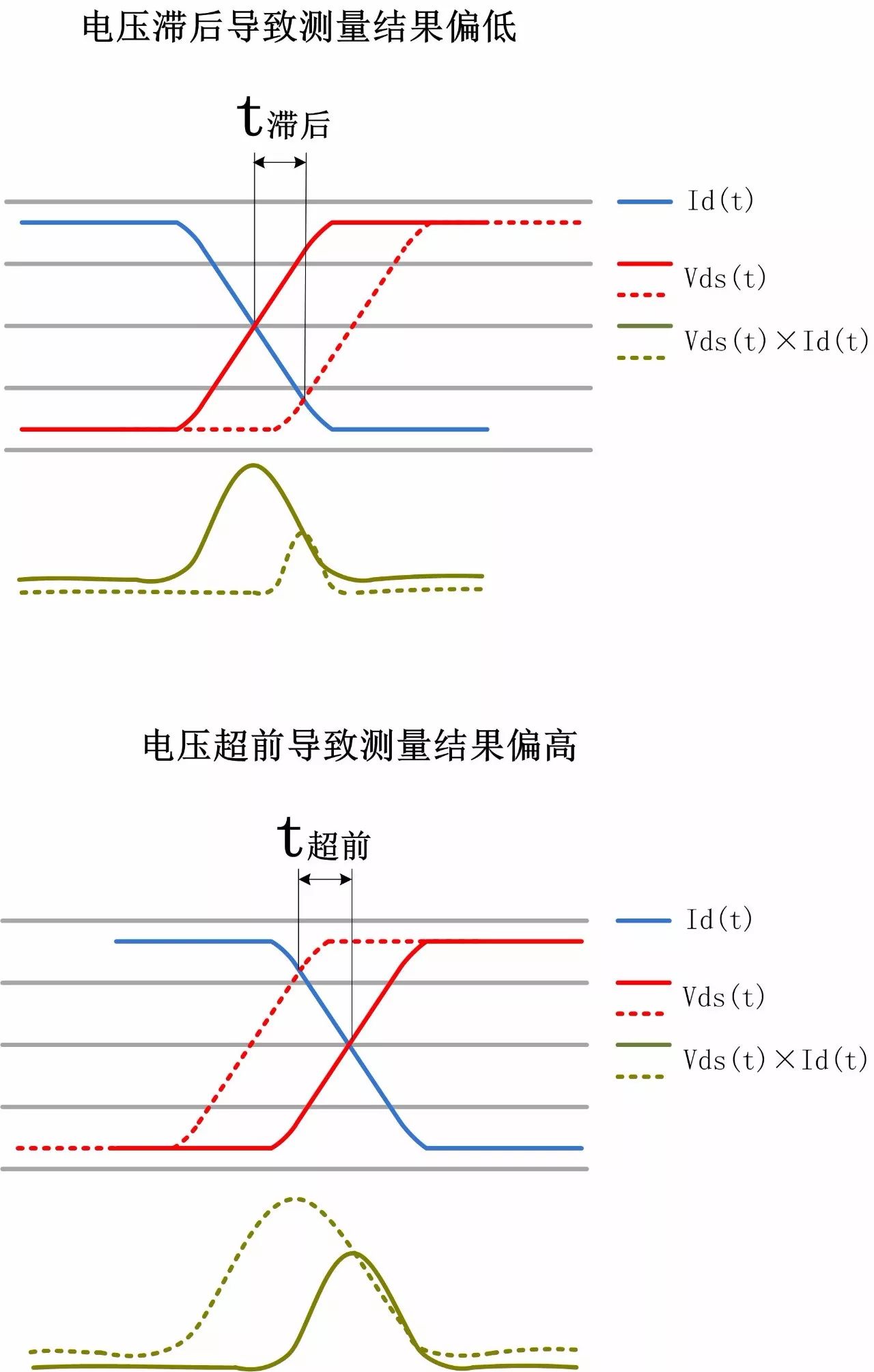 当电压通道和电流通道之间存在时间偏移时,测量结果明显偏高或偏低,而器件的开关速度越快,偏移的影响就越明显。图1为MOS管的关断损耗测量原理图,由此可见,只有经过校正以后,才能得到正确的测量结果。值得注意的是,由于电压探头和电流探头的实现原理和探头传输电缆长度的差异,这种偏移是普遍存在的。