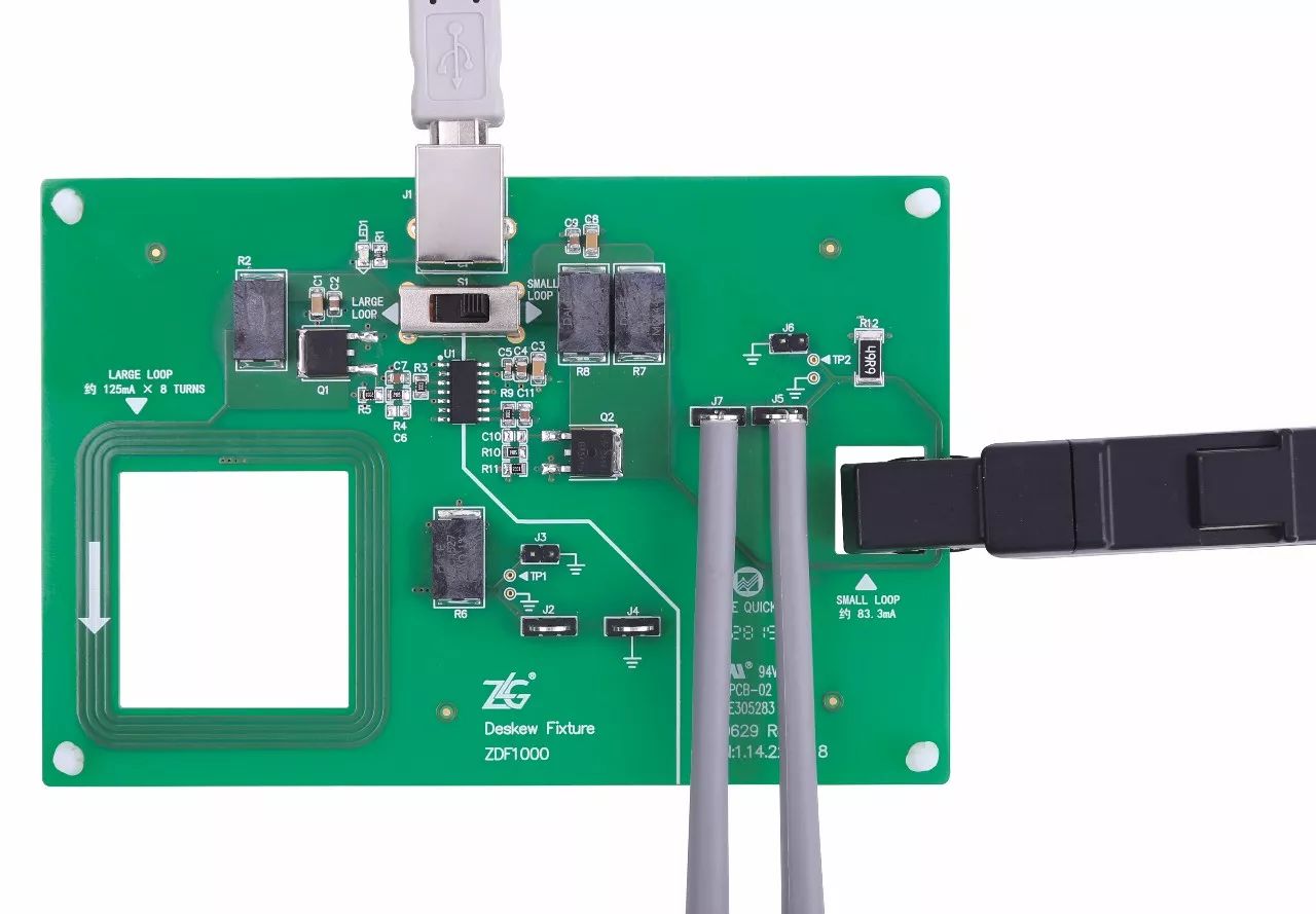 如图2所示,偏移校正夹具可以直接校正电压探头和电流探头之间的时间偏移。其基本原理是夹具产生一组相位差为零的电压和电流的脉冲信号同时作用在电压和电流探头上,通过示波器观察脉冲信号经过探头后的时间偏移,并在示波器上校正偏移时间。