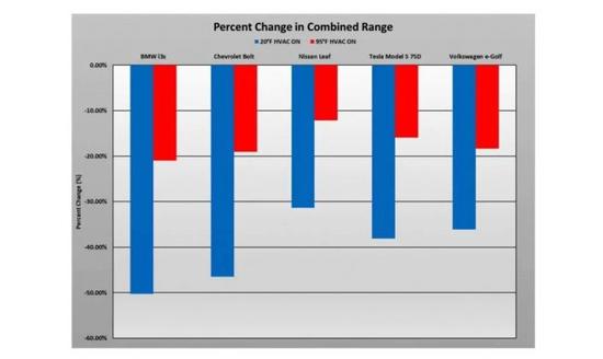 5辆电动车型测试结果,图片来源:美国汽车协会(AAA)