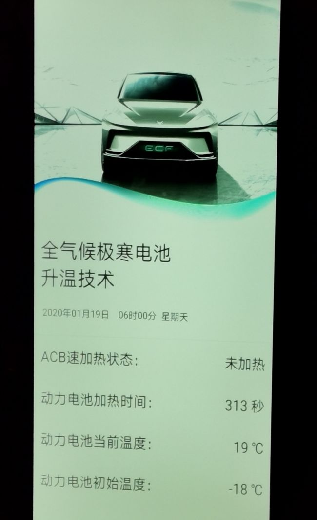 测试从凌晨5:30开始,此时温度计显示当地气温超过零下-30度,无论是技术人员、工作人员,还有参加活动的媒体记者都全副武装穿上了厚重的棉服羽绒服。此时北汽新能源和北汽福田的测试车辆在顺利成功启动后一直保持稳定运行,电池系统以7℃/min持续升温,直至电池正常的工作温度20°。从而确保整车续航里程与正常环境下基本匹配。整个挑战试验过程相当顺利,挑战成功。