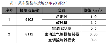 在进行测试前,需根据整车接地系统分布图整理接地分布表,该表中包括接地点名称,每个接地点下对应的电气负载及每个电器负载接地线的线径,如下表 1 所示: