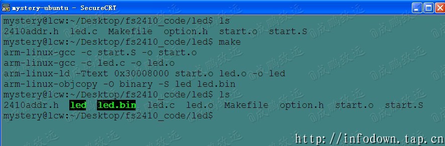 1 2 3 4 5 6 7 | led.bin: start.S led.c arm-linux-gcc -c start.S -o start.o arm-linux-gcc -c led.c -o led.o arm-linux-ld -Ttext 0x30008000 start.o led.o -o led arm-linux-objcopy -O binary -S led led.bin 6 clean: rm -f *.o led.bin |