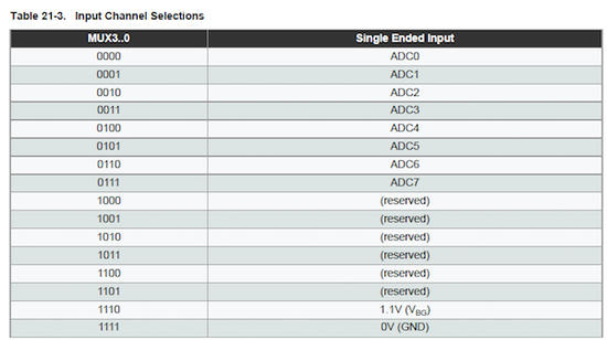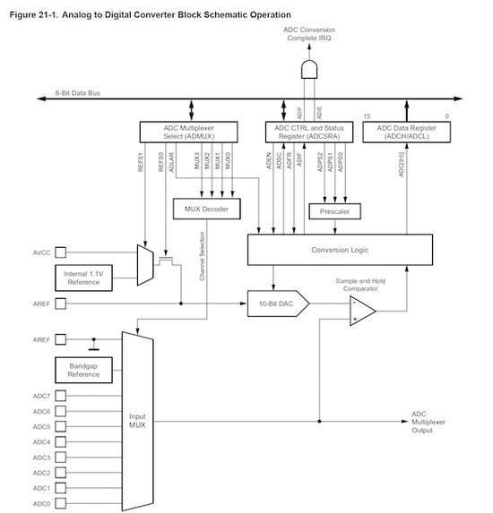 使用ADC非常简单。选择将从中取出模拟读数的通道,然后,为了开始转换,ADSC位(在ADCSRA中找到)将打开。转换完成后,ADC硬件会自动清零ADSC位。