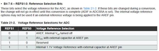 ATmega168上的ADC可以介于0V和某个参考电压之间,通常设置为VCC。由于大多数电路都是这种情况,我们需要将Aref引脚连接到也接地的电容,我们还需要将REFSx位设置为使用AVCC作为参考。