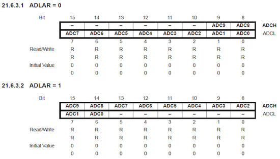 当ADC完成转换操作后,结果存储在一对中8位寄存器(10位结果不适合单个8位寄存器)。由于ATmega是原生的8位器件,因此使用8位ADC不如10位结果更有意义,但这会降低结果的分辨率。但是,必须正确读取10位数的8位结果,否则结果将不正确。为此,我们需要读取前8位(位9-2),而不是后8位。使用ADLAR位很容易实现,当设置为1时,将使ADC结果保持正确。这意味着我们不需要读取结果寄存器(ADCH和ADCL)并进行一些操作,而是直接读取ADCH并忘记ADCL。