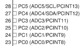 现在我们可以直接读取ADCH以获得8位结果,而不必担心位操作(在分辨率的成本),我们现在需要配置我们的模拟引脚。默认情况下,ATmega168上的I/O引脚配置为数字引脚,这意味着它们只能处理1和0。因此,要将输入配置为模拟引脚,我们使用DIDR0寄存器,它代表数字输入禁用寄存器。不幸的是,并非每个引脚都具有模拟输入的能力,因此请务必注意带有标签ADCx的引脚。例如,引脚23至28是ATmega168上的模拟输入引脚。