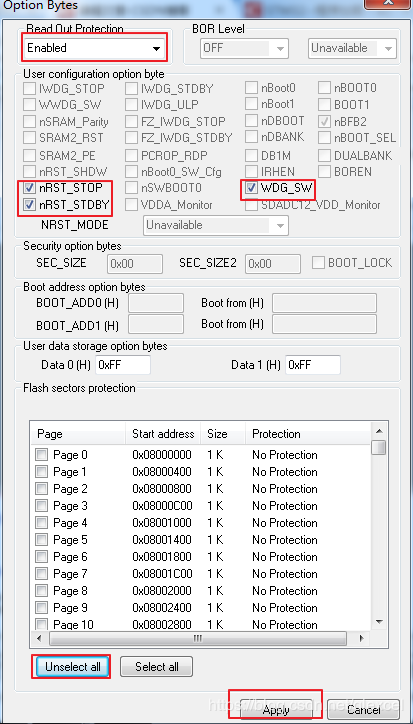 选择使能读保护,下面几个复选框一般勾上即可,比如WDG_SW是控制是否打开硬件看门狗的,如果不勾,就会打开,造成芯片一段时间后自动复位。再下面是扇区保护的选择(以4页为单位),建议不勾选,勾选后似乎远程升级不能成功(比如IAP),没有测试过。