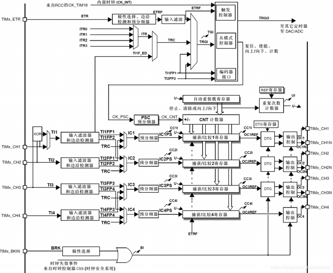 4、内部触发输入(ITRx):使用一个定时器作为另一个定时器的预分频器。如可以配置一个定时器Timer1而作为另一个定时器Timer2的预分频器。