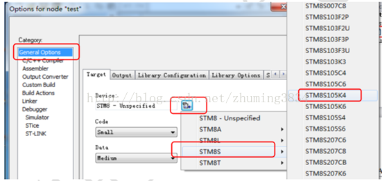2. 选择单片机型号,在General Options --> Target --> Device下选择,我使用的是stm8s105k4t6,故我选择STM8S105K4 。