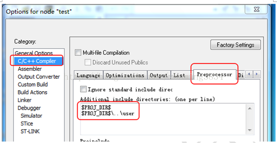 3. 在C/C++ Compiler 下的Preprocessor 里输入$PROJ_DIR$