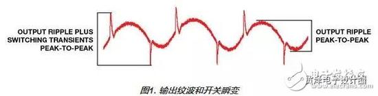 输出纹波和开关瞬变取决于调节器拓扑以及外部元器件的数值与特性。输出纹波是残余交流输出电压,与调节器的开关操作密切相关。其基频与调节器的开关频率相同。开关瞬变是在开关转换过程中发生的高频振荡。它们的幅度以最大峰峰值电压表示,该值很难精确测量,因为它与测试设置高度相关。图1显示输出纹波和开关瞬变示例。